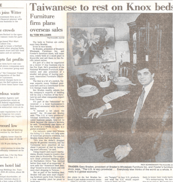 After a transformative trip to China and Taiwan in 1985, Gary Braden founded Associated Furniture Importers (AFI), bringing high-quality furniture parts to Knoxville. AFI specialized in assembly and cartoning, supplying retail dealers across the Southeast, including Sam’s Wholesale. This venture marked a new chapter in Bradens legacy, combining global sourcing with local craftsmanship to expand the business’s reach and impact.